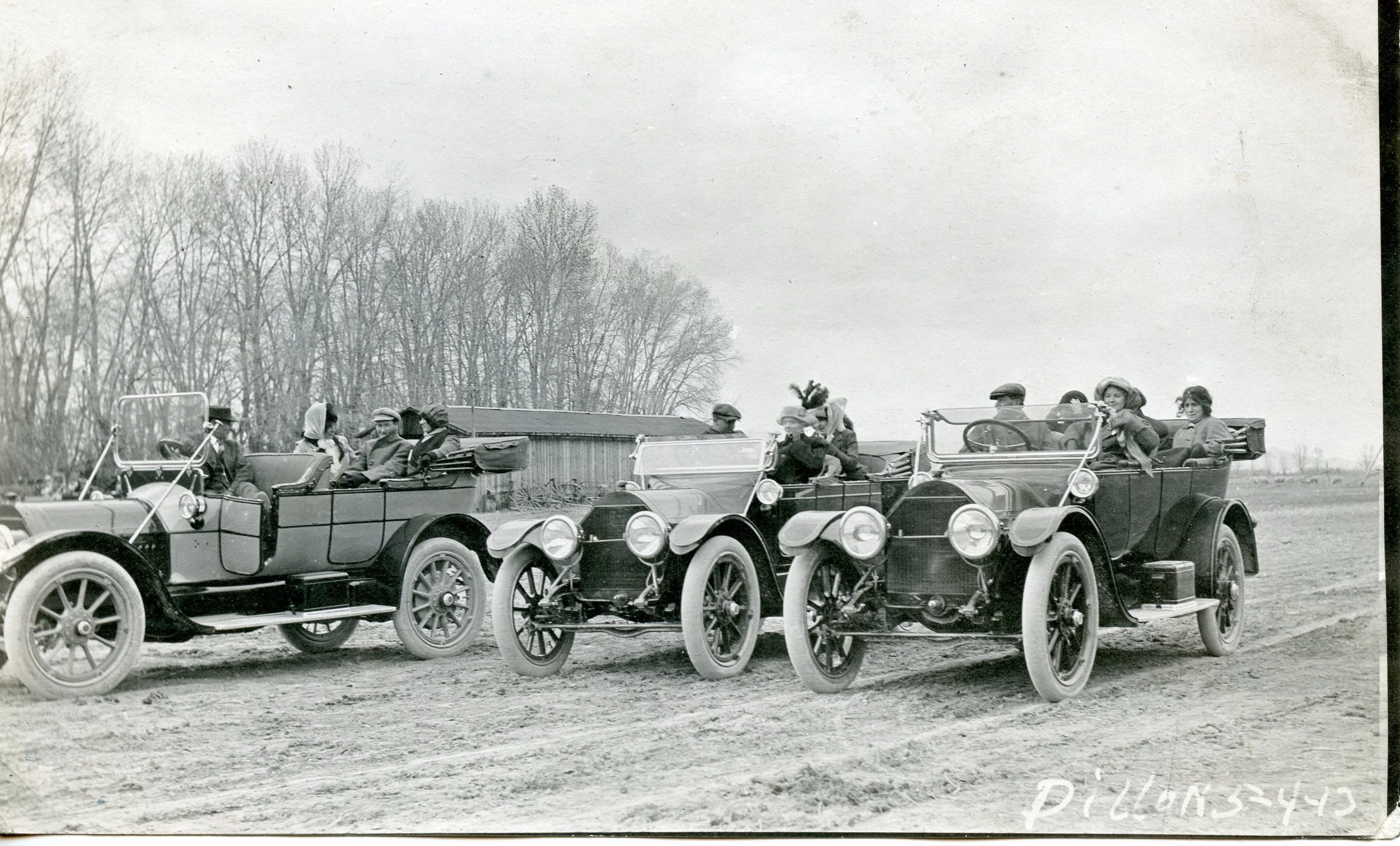 #021118-01 A pair of 1909 (?) Halladay automobiles, a pair of 1909 (?) Jackson automobiles, and a pair on the left that we need to identify.