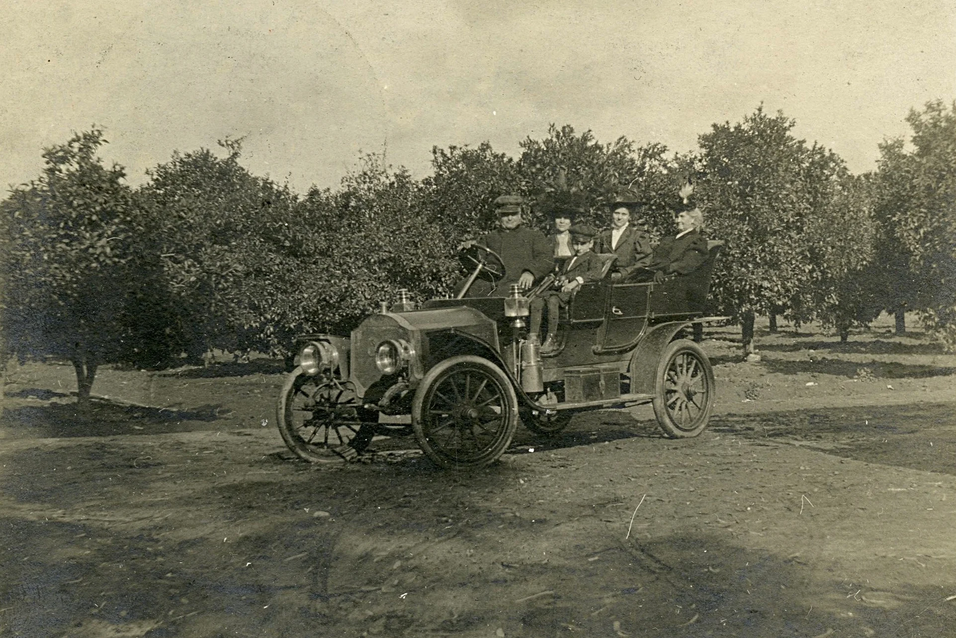 #052017-01 1909 Fowler CA in front of the orange groves.